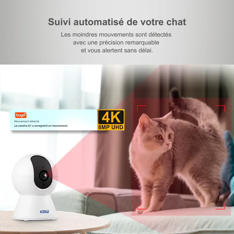 Une caméra qui suit les mouvements de votre chat pour vous alerter en temps réel. Vision ultra nette, rotation 360°, audio bidirectionnel et application mobile : vous avez le contrôle total, à tout moment.