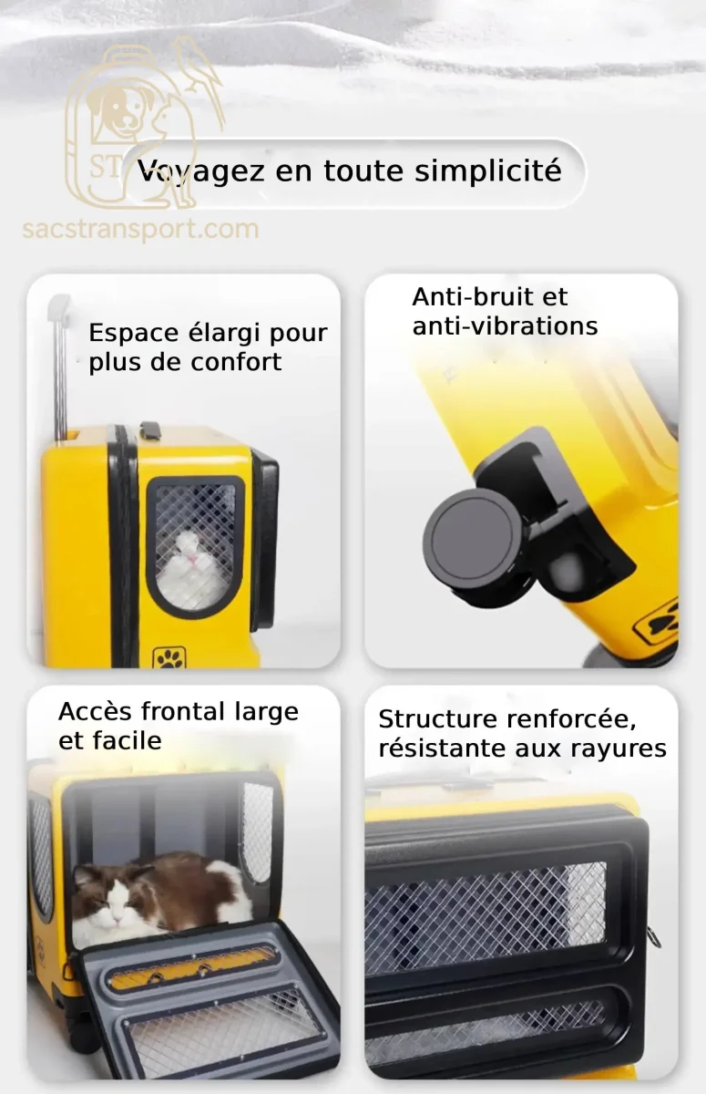 De plus le bruit est souvent une source d’angoisse pour les animaux. Avec ses roulettes ultra-silencieuses, cette valise de transport chat minimise les nuisances sonores, rendant vos trajets plus agréables pour vous et votre compagnon. Dans les gares ou les aéroports, ce détail devient un atout précieux pour voyager sans stress.